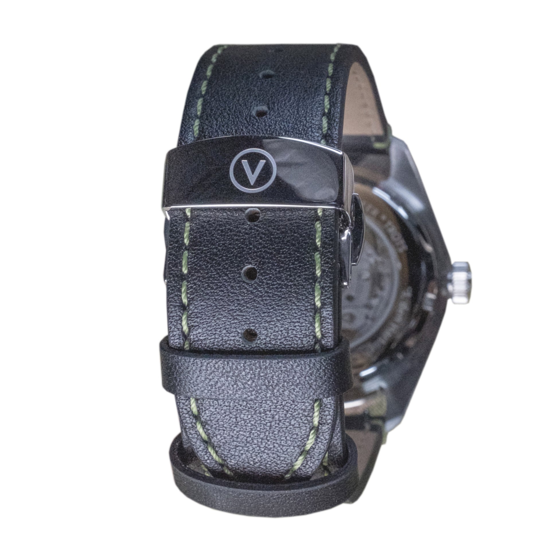 - Band: Kalfsleer met groen stiksel en vlinder vouwsluiting met pushers; extra stalen band en toekomstige rubberband beschikbaar
