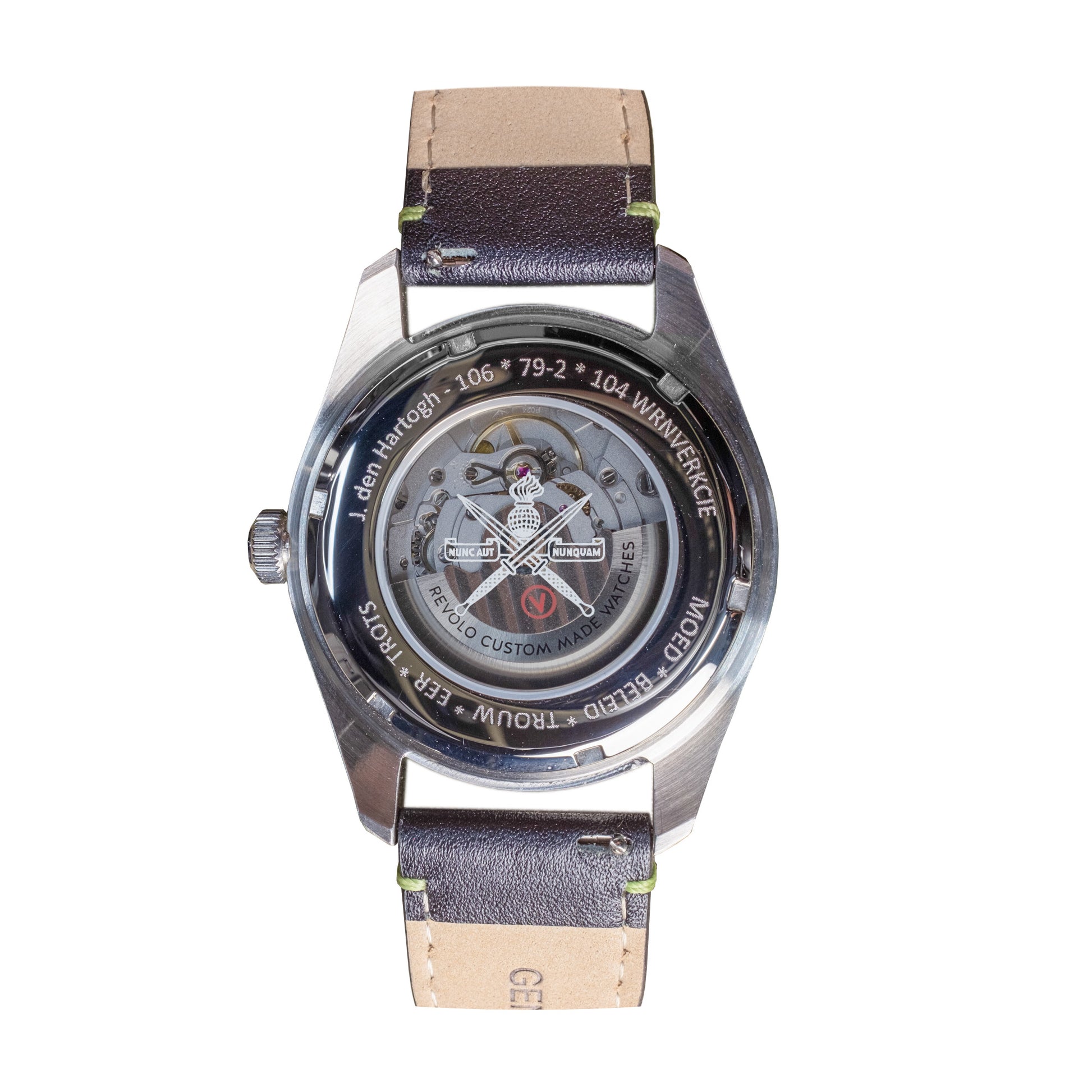 Geef, alvorens te bestellen, bij het onderstaande kopje ‘Personalisatie’ aan wat er op de achterzijde van het horloge gegraveerd mag worden. (Als u bij ‘eenheid’ een Commando-eenheid invult, controleren wij dit in het officiële register van (oud)-Commando’s.)